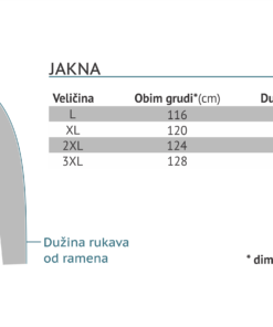 Jakna od laganog materijala sa tanjim punjenjem, idealna za jesenje uslove. Na ramenom delu ojačanje od 300D materijala. Kapuljača je na skidanje. Na grudnom delu nalaze se dva vertikalna džepa sa kopčanjem na rajsferšlus. U donjem delu se nalaze dva kosa lajsna džepa. Na krajevima rukava nalazi se render/rukavica sa otvorom za palac. Jakna je ojačana ringlicama.